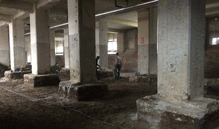 Nach 2 Wochen Pause auf der Baustelle geht es nun mit neuem Schwung fürs Jahr 2016 weiter, wenn uns der Winter nicht dazwischen kommt. Durch die lange Urlaubszeit gibt es auch nicht so viel zu berichten. Das Erdreich wurde abgetragen und das Souterrain wirkt durch die Freilegung der Stützpfeiler fast tempelartig. Während der Abriss in den oberen Geschossen weiter geht, müssen zur Fortführung der Arbeit im Souterrain die Ergebnisse der Beprobungen vorliegen.