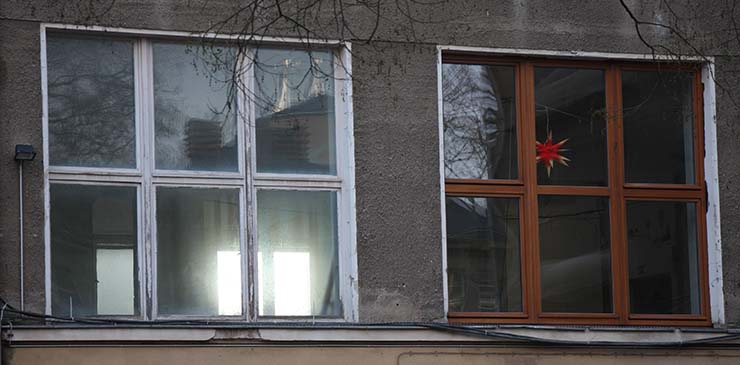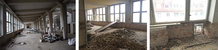 Im gesamten Gebäude B ist der Putz der Innenseite der Außenwand bis Brüstungshöhe abgenommen worden.