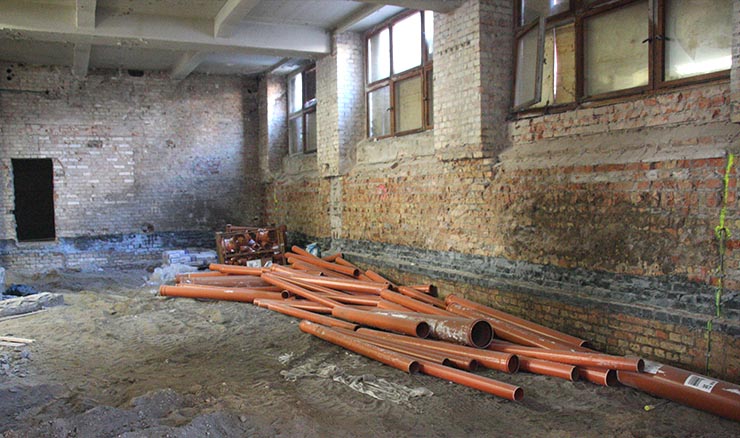 Nachdem die Beprobung des Erdreichs unter der Bodenplatte negativ ausgefallen ist und keine weitere Abtragung gemacht werden muss, wurde bereits der neue Blitzschutz verlegt.