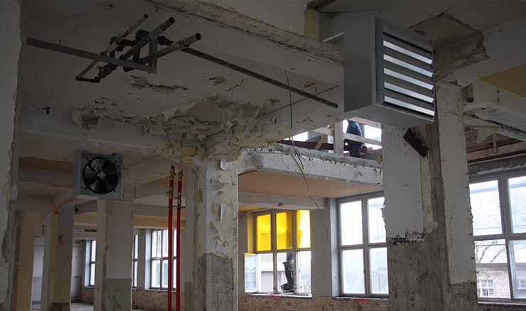 Für den Fall, daß der Winter doch noch einmal zupackt, wurde im Gebäude eine Bauheizung montiert.
