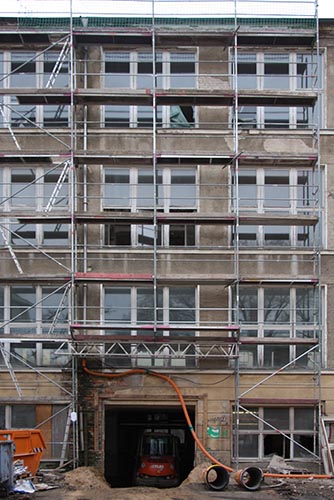 Im Hof verkündet ein erstes Stück Rüstung bereits die Vorbereitungen für die Arbeiten an dem neuen Treppenhaus, das hier entstehen soll.