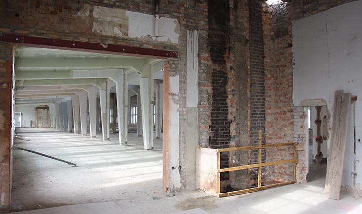 Der alte dreizügige Schornstein ist komplett abgerissen. Daneben kann man sehr schön einen der neuen