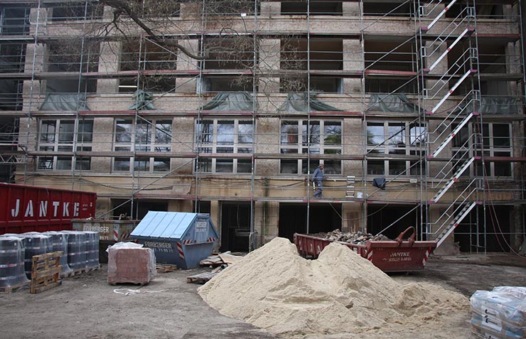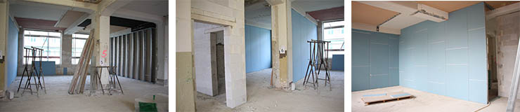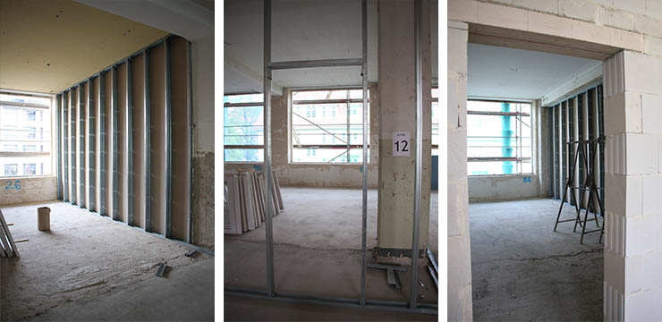 Die Geschwindigkeit der Baustelle nimmt zu. Jeden Tag werden neue Innenwände gebaut. In den ersten drei Geschossen sind bereits viele neue Räume entstanden. Speziell im Obergeschoss, der ersten Wohnetage, ergibt sich täglich ein neues Raumgefühl. Plötzlich kann man eine Wohnung betreten oder auf einen Flur hinaustreten.