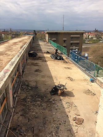 Die Schalung dafür ist in Arbeit. Andere Betondecken sind gebrochen, konnten aber repariert werden. Diese mussten zuerst sandgestrahlt werden und sind nun bereits verspachtelt.