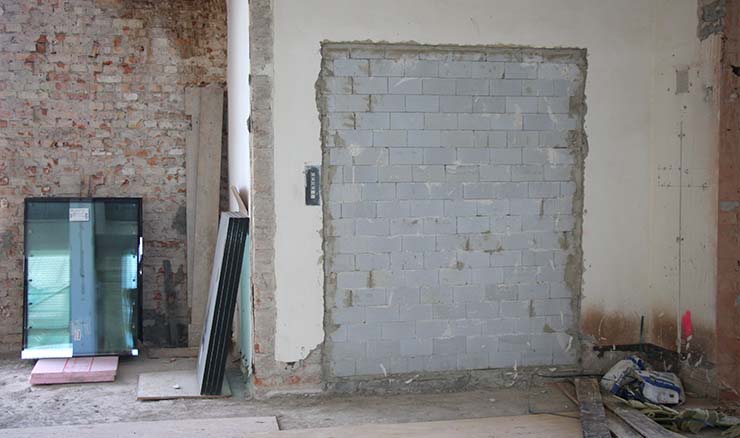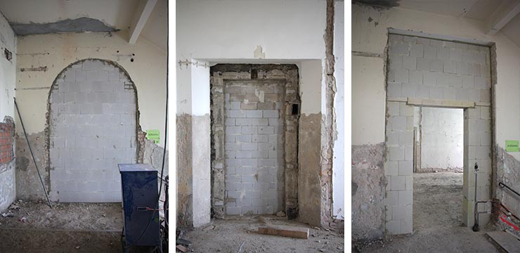 Beschädigtes Material wurde entfernt und durch neue Ziegel ersetzt. Außerdem wurden in den letzten 3 Wochen auch viele alte Türöffnungen zugemauert, die in den neuen Grundrissen nicht mehr gebraucht werden.