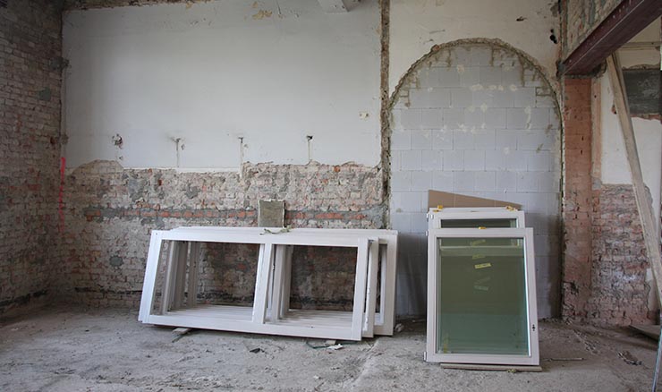 Der Einbau der Fenster ist vorangeschritten und mittlerweile im Obergeschoss fertiggestellt. Außerdem wurden vielen Flächen neu verputzt, Innenseiten der Außenwände sowie neu gestellte Innenwände.